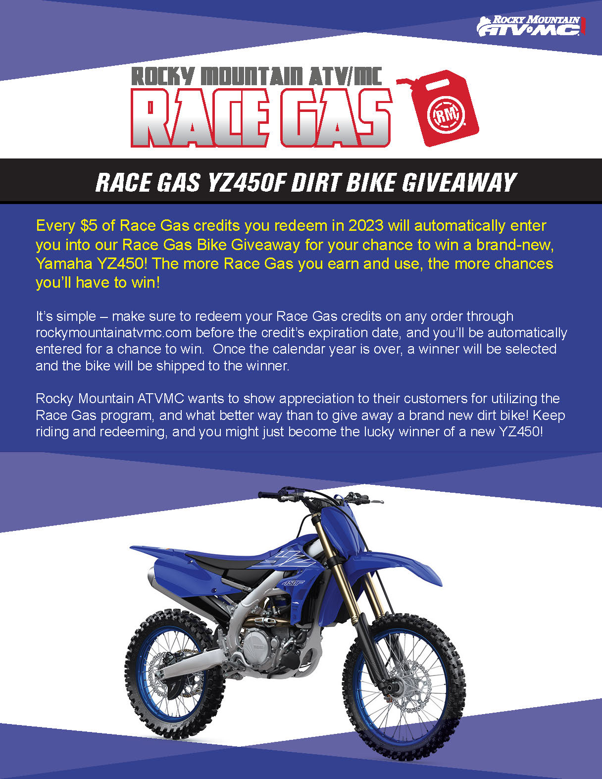 Our RaceGas Contingency Program is now offering you a chance to win a BRAND NEW 2023 YZ450F!